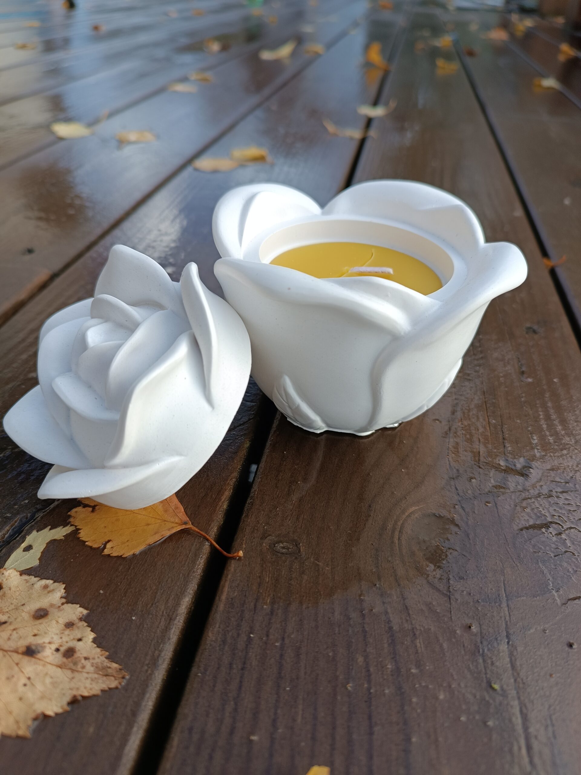 Käsitsi valmistatud roosikujulises kipsist topsis luksuslik mesilasvahast küünal.